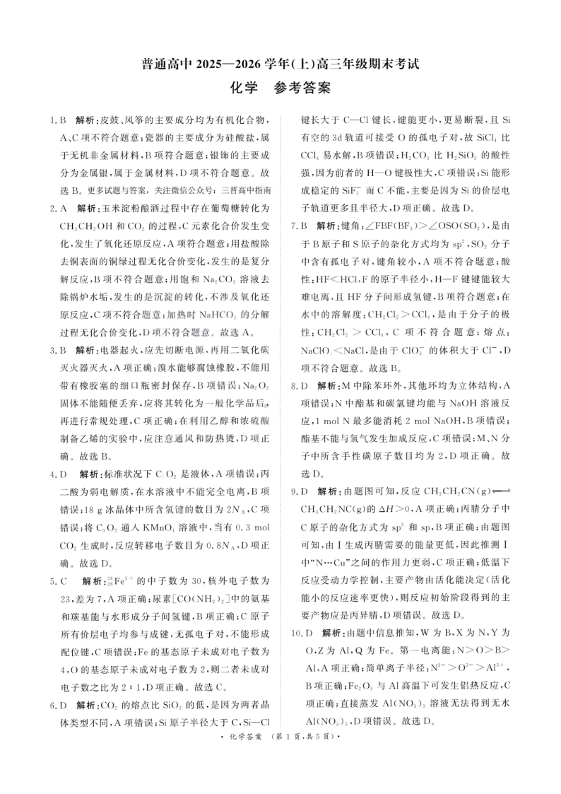 高三化学答案--河南省青桐鸣大联考普通高中2026届高三上学期期末考试