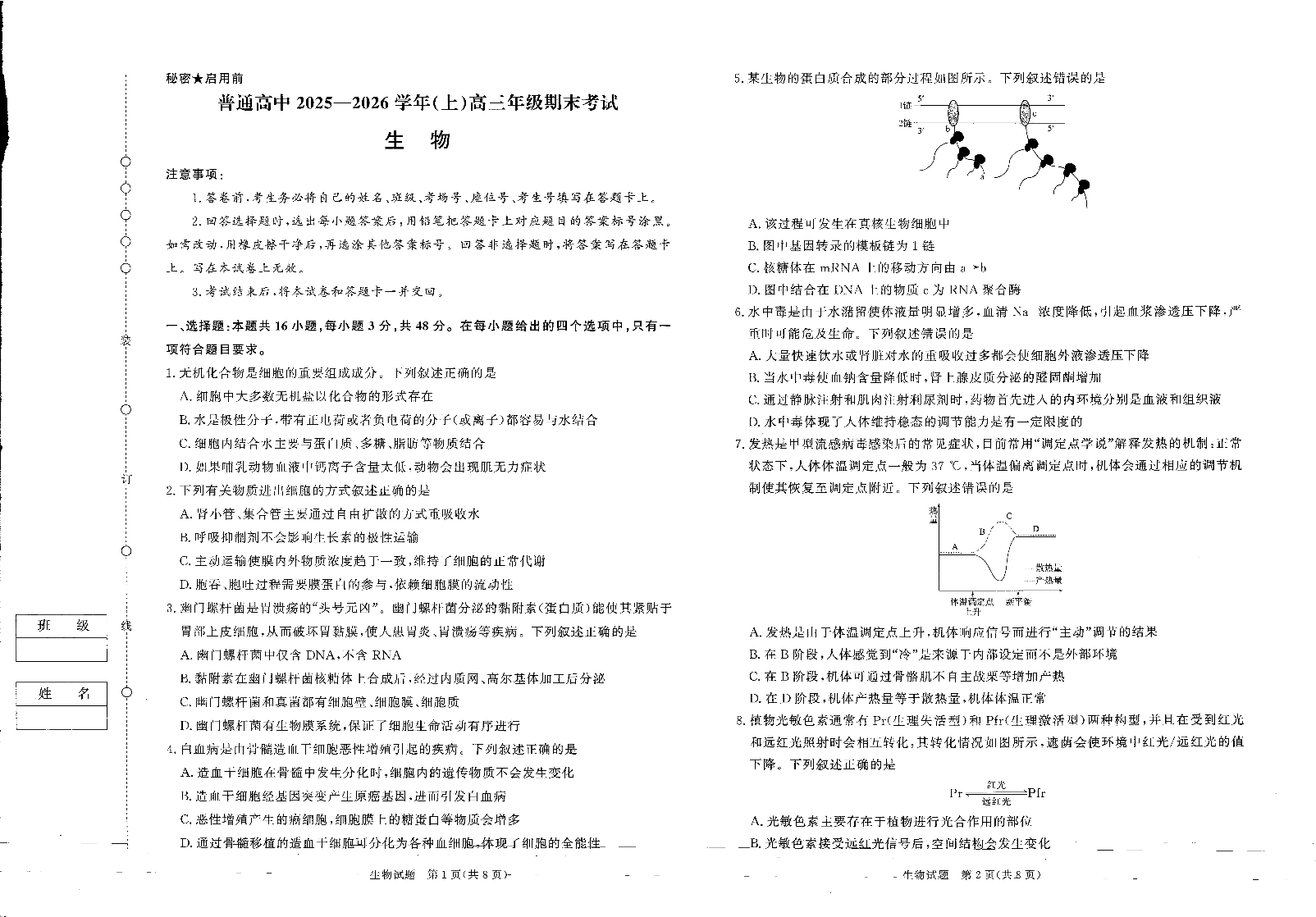 高三生物--河南省青桐鸣大联考普通高中2026届高三上学期期末考试