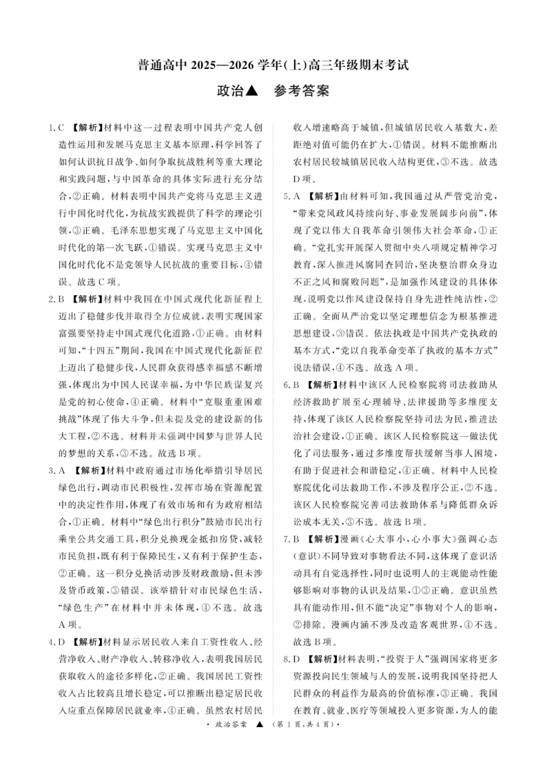 高三政治答案--河南省青桐鸣大联考普通高中2026届高三上学期期末考试
