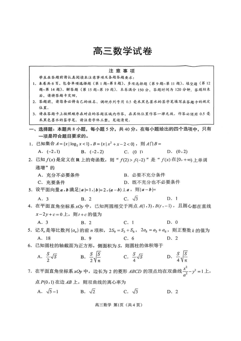 高三数学+答案--江苏省苏州市2026届高三上学期期末考试(苏州零模)