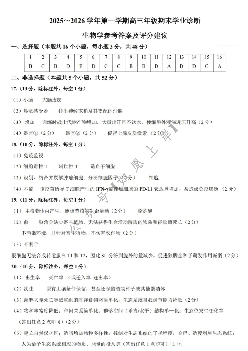 高三生物答案--山西省太原市2026届第一学期高三年级期末学业诊断