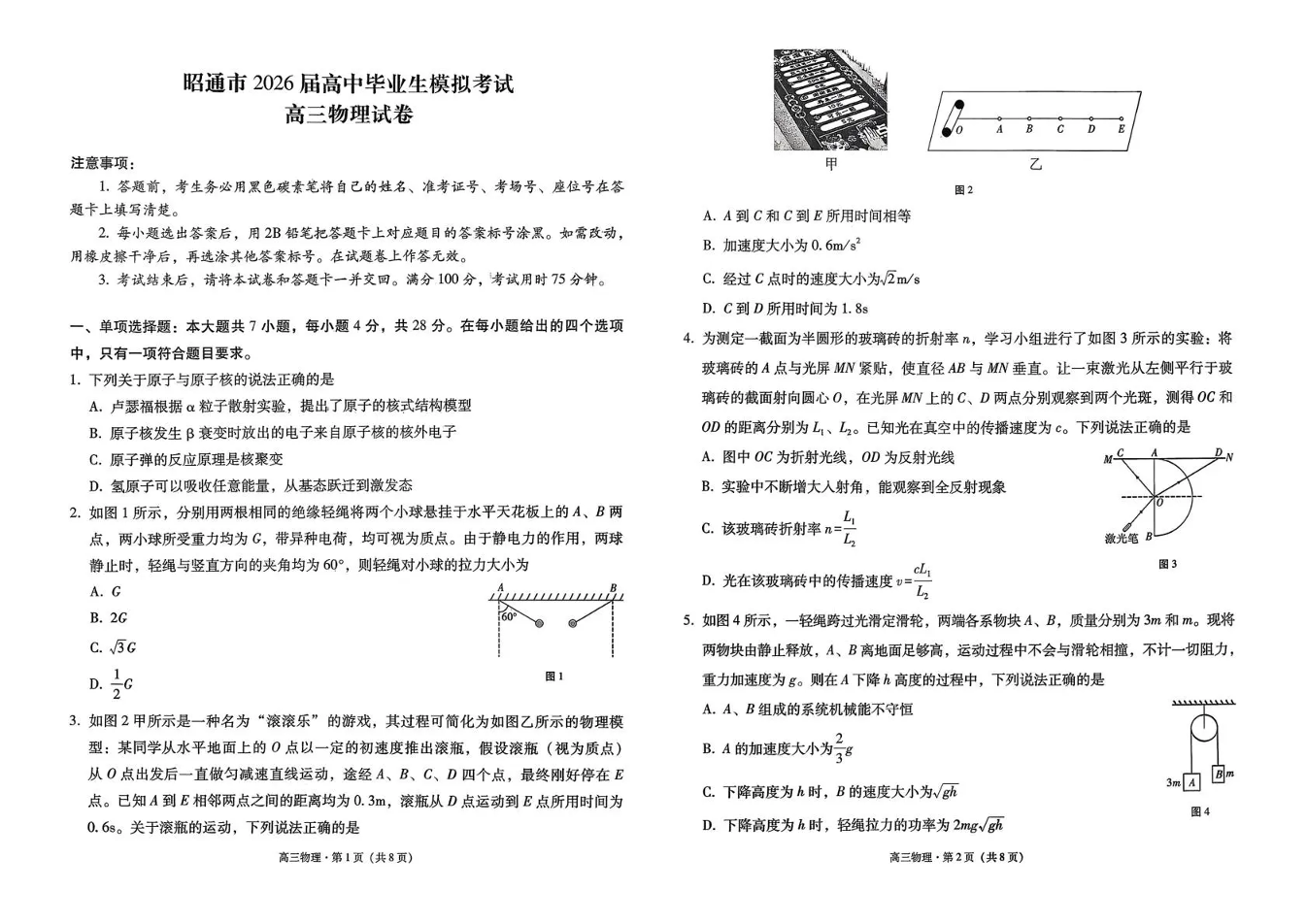 高三物理--云南省昭通市2026届高中毕业生上学期期末模拟考试