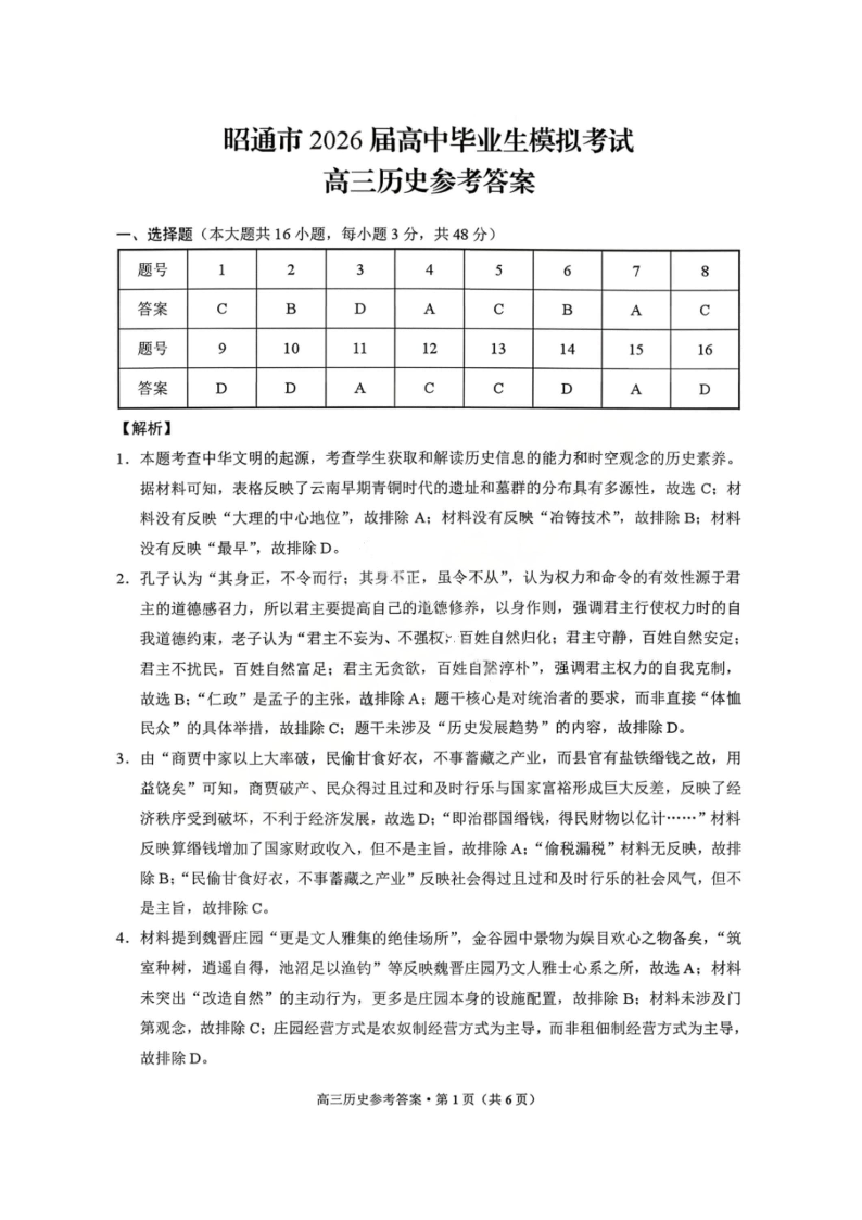 高三历史答案--云南省昭通市2026届高中毕业生上学期期末模拟考试