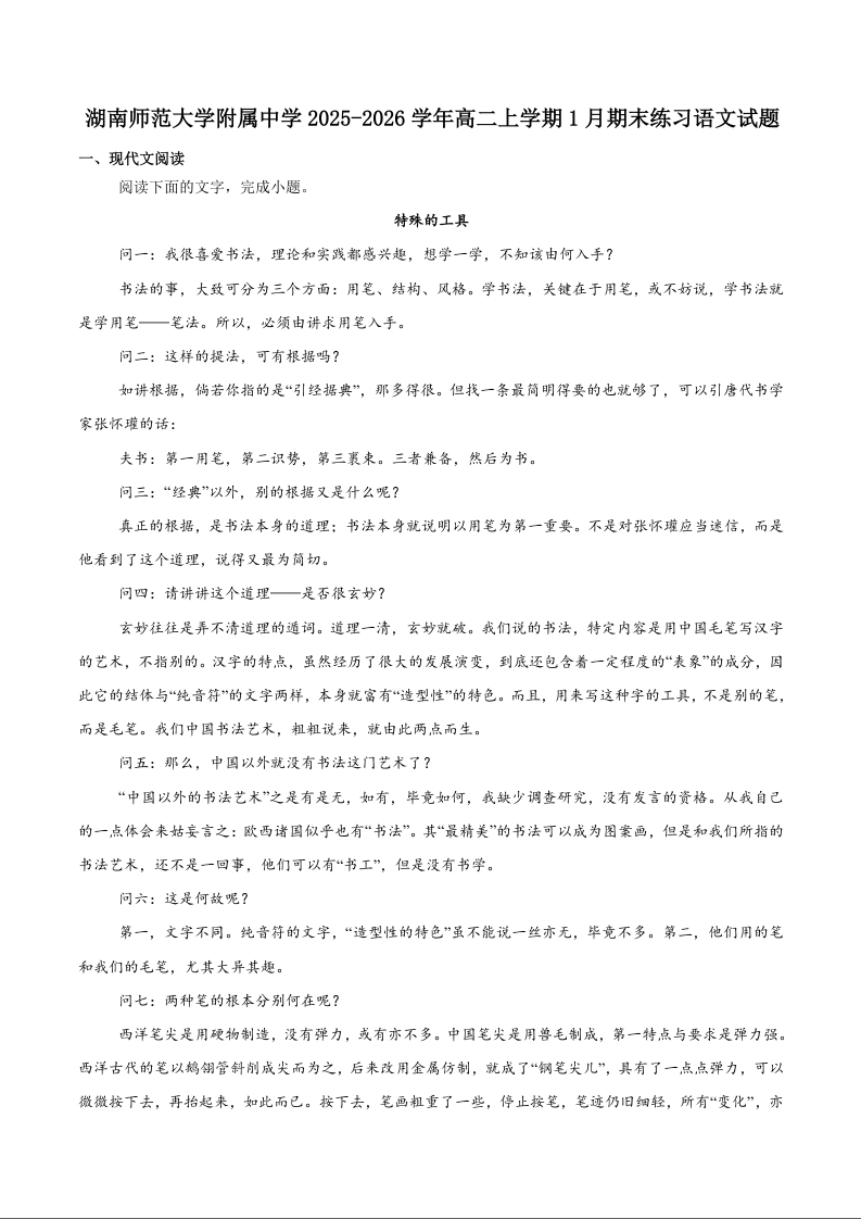 高二语文+答案--湖南师范大学附属中学2025-2026学年高二上学期1月期末试题