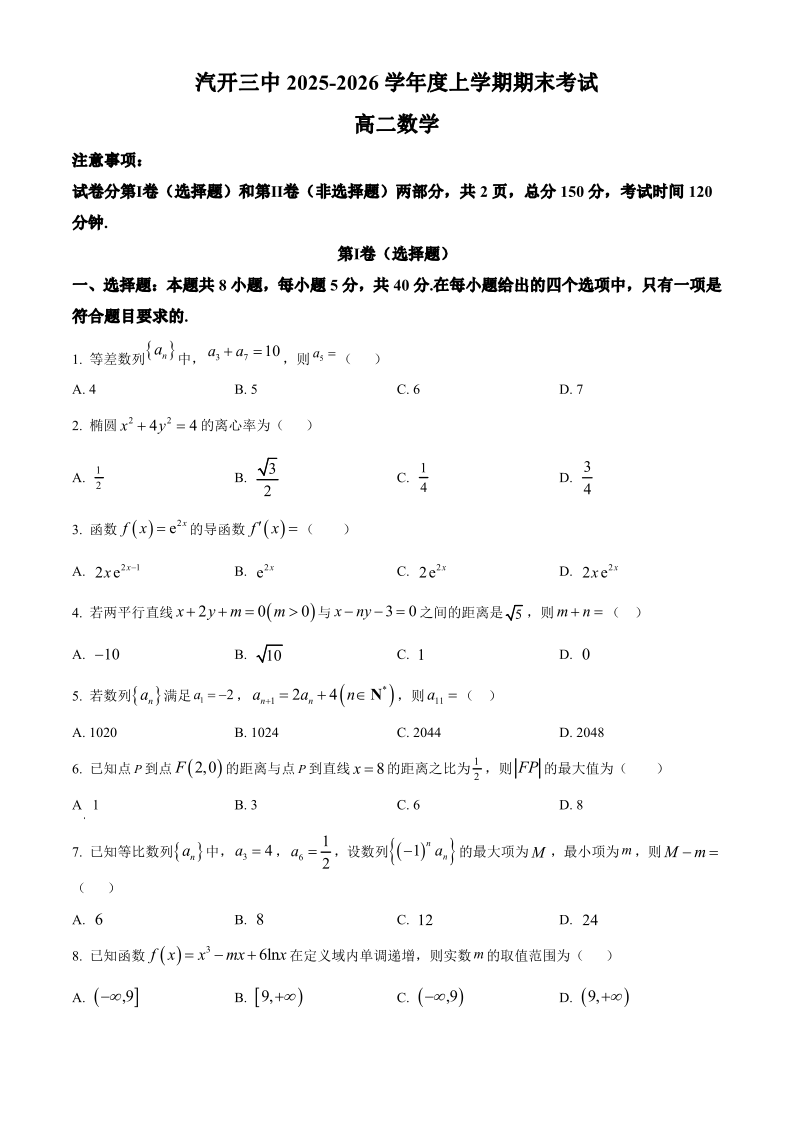 高一数学+答案--吉林省长春市长春汽车经济技术开发区第三中学2025-2026学年高二上学期期末考试