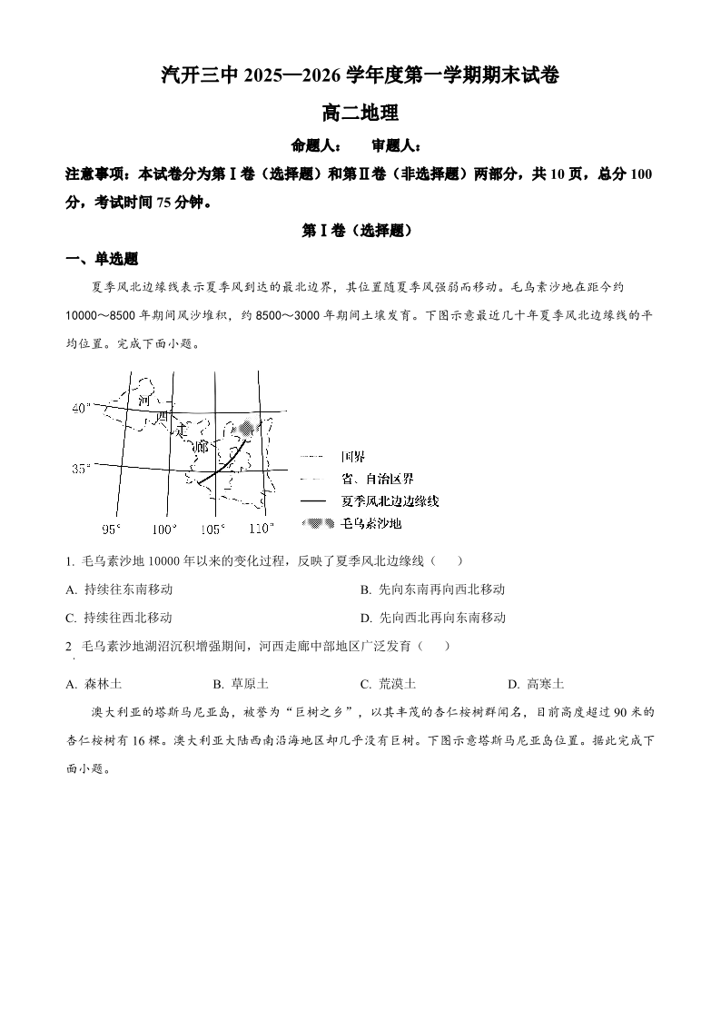 高一地理+答案--吉林省长春市长春汽车经济技术开发区第三中学2025-2026学年高二上学期期末考试