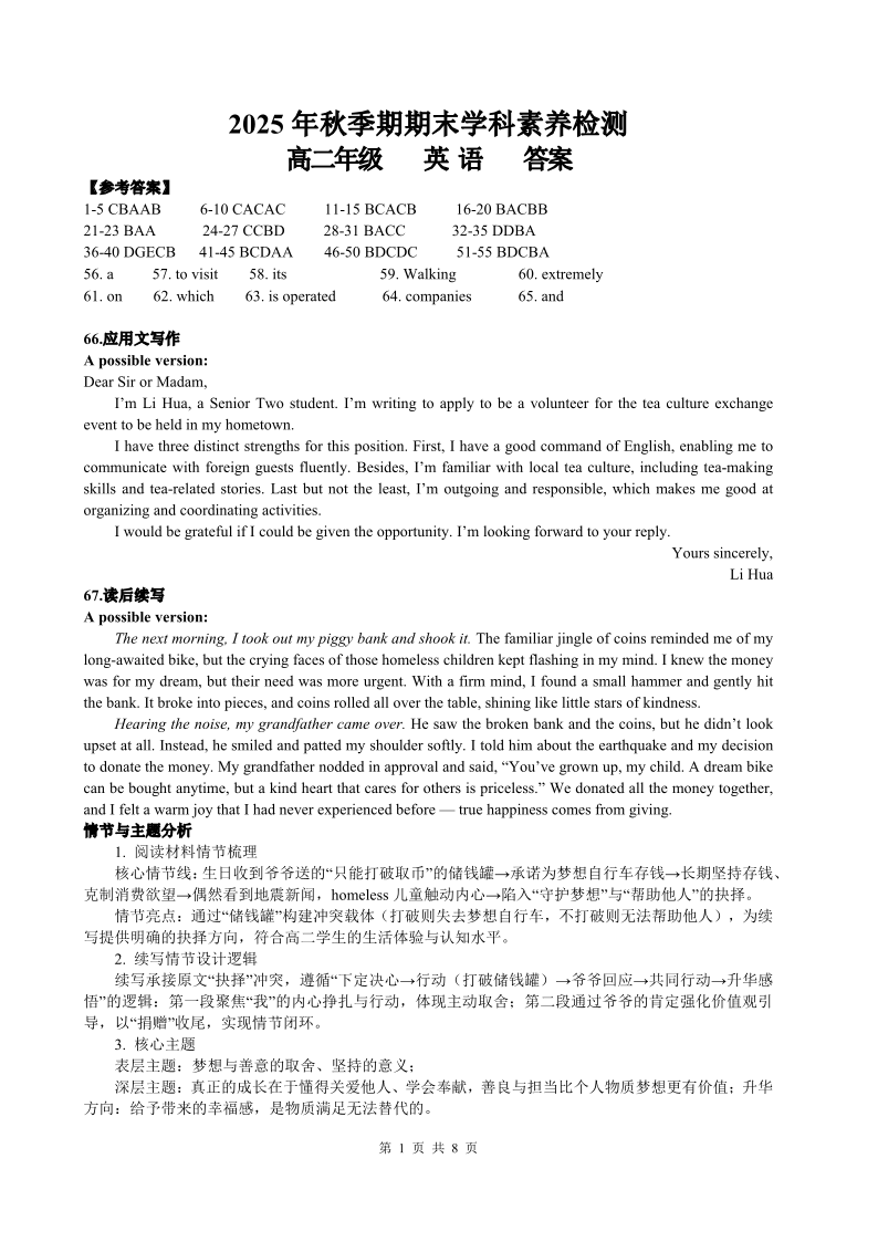 高二英语答案--广西贵港市部分高中2025-2026学年高二上学期期末学科素养检测