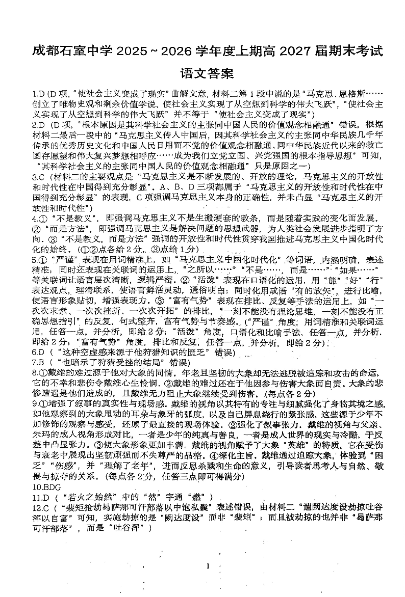高一语文答案--四川省成都石室中学2025-2026学年度上期高二期末考试