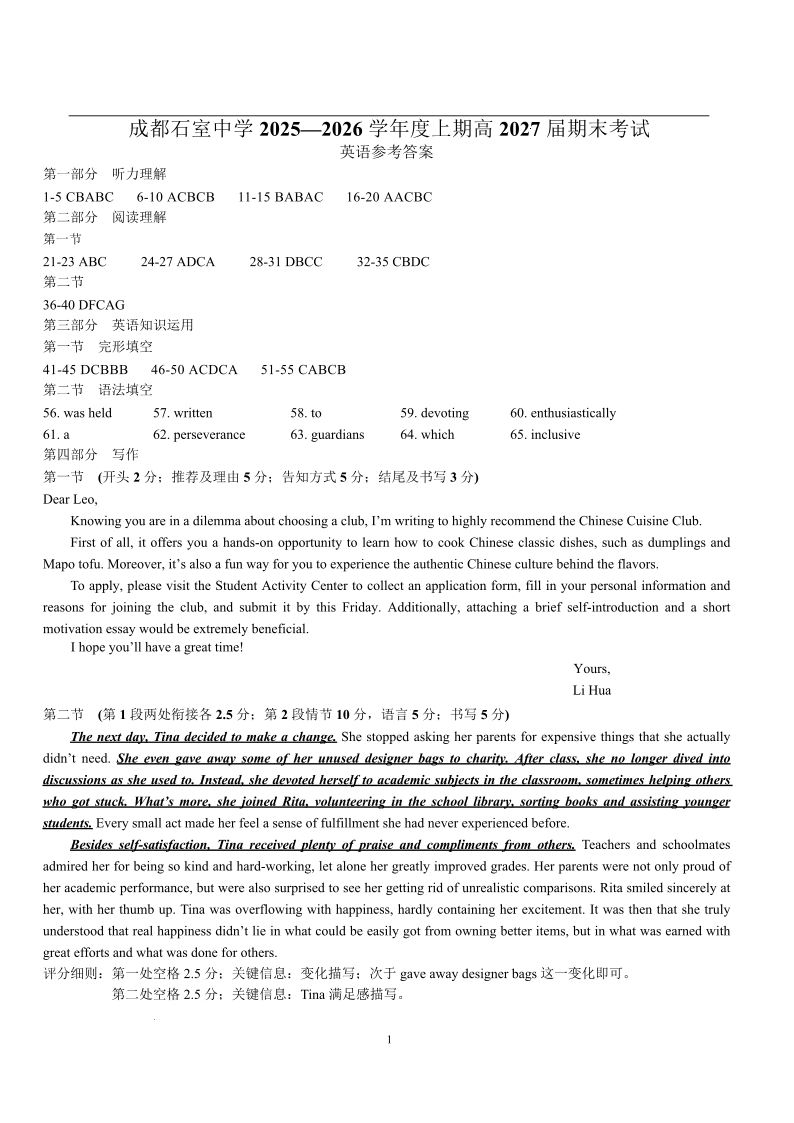 高一英语答案--四川省成都石室中学2025-2026学年度上期高二期末考试