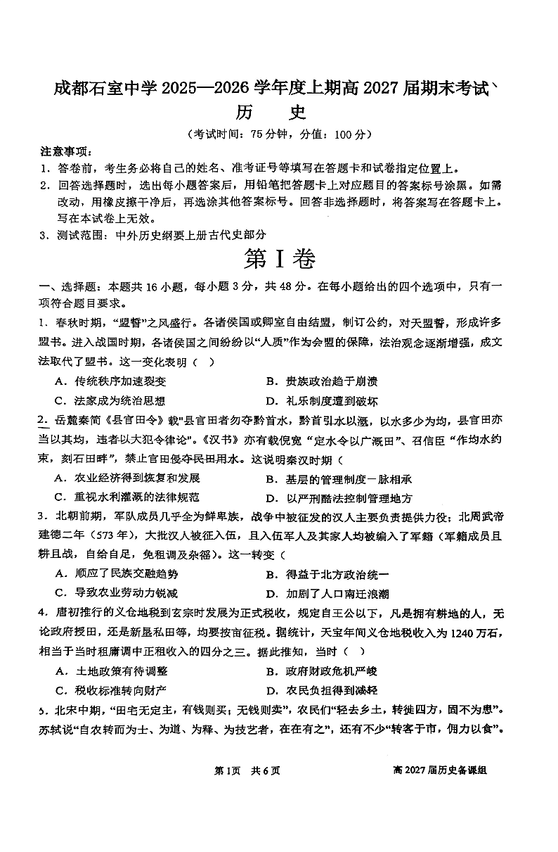 高二历史+答案--四川省成都石室中学2025-2026学年度上期高二期末考试