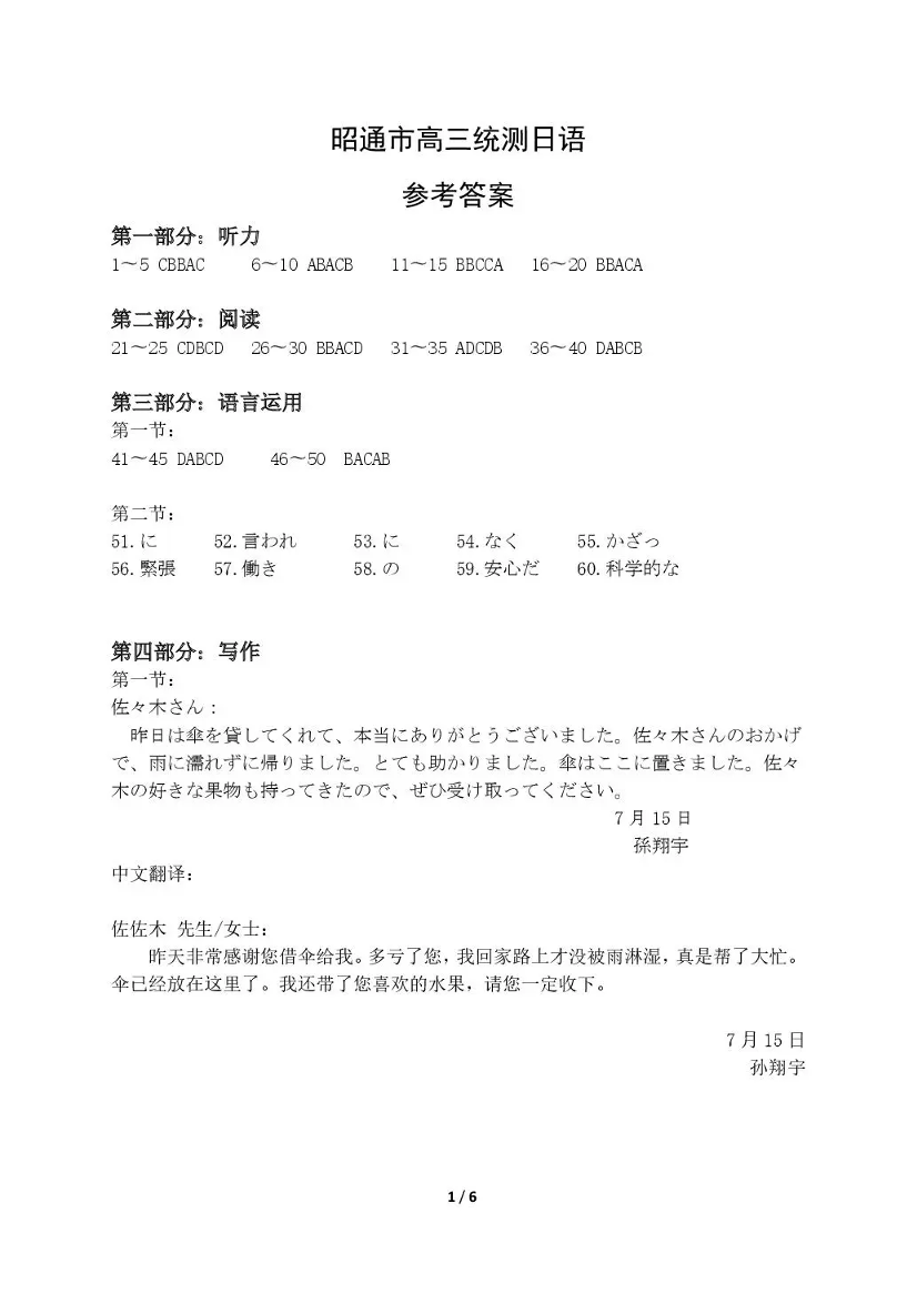 高三日语答案--云南省昭通市2026届高中毕业生上学期期末模拟考试