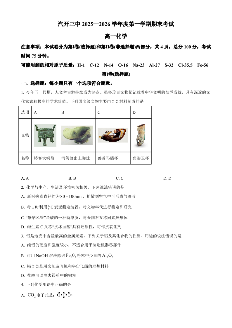 高一化学+答案--吉林省长春市长春汽车经济技术开发区第三中学2025-2026学年高一上学期期末考试
