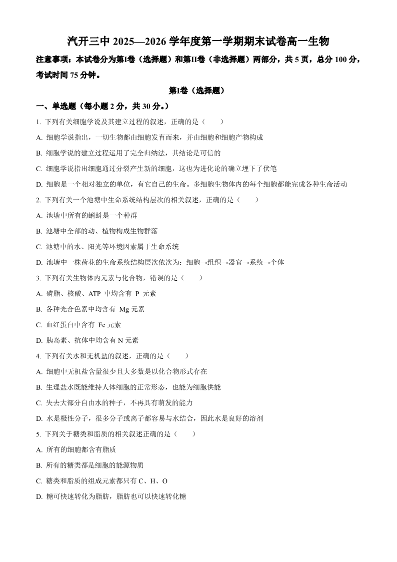 高一生物+答案--吉林省长春市长春汽车经济技术开发区第三中学2025-2026学年高一上学期期末考试