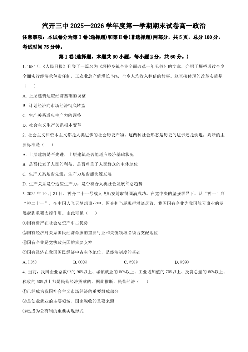 高一政治+答案--吉林省长春市长春汽车经济技术开发区第三中学2025-2026学年高一上学期期末考试