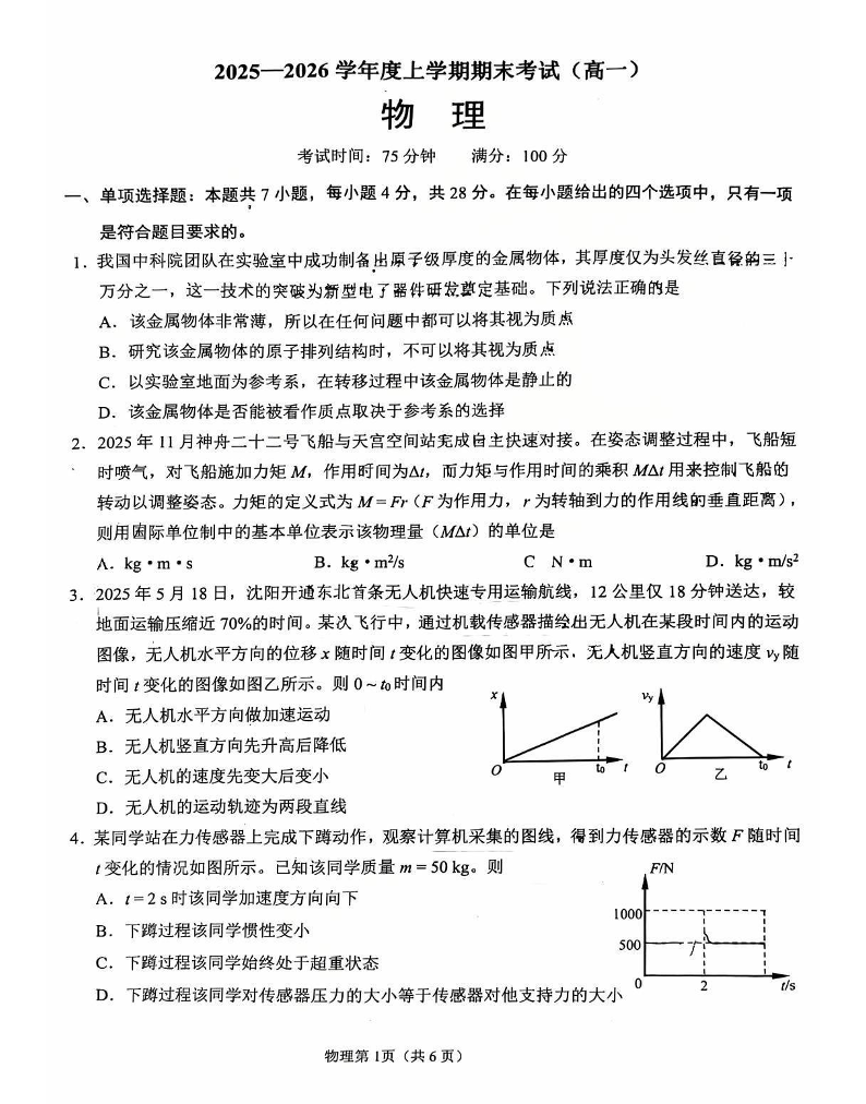 高一物理+答案--辽宁省鞍山市2025-2026学年高一上学期期末考试