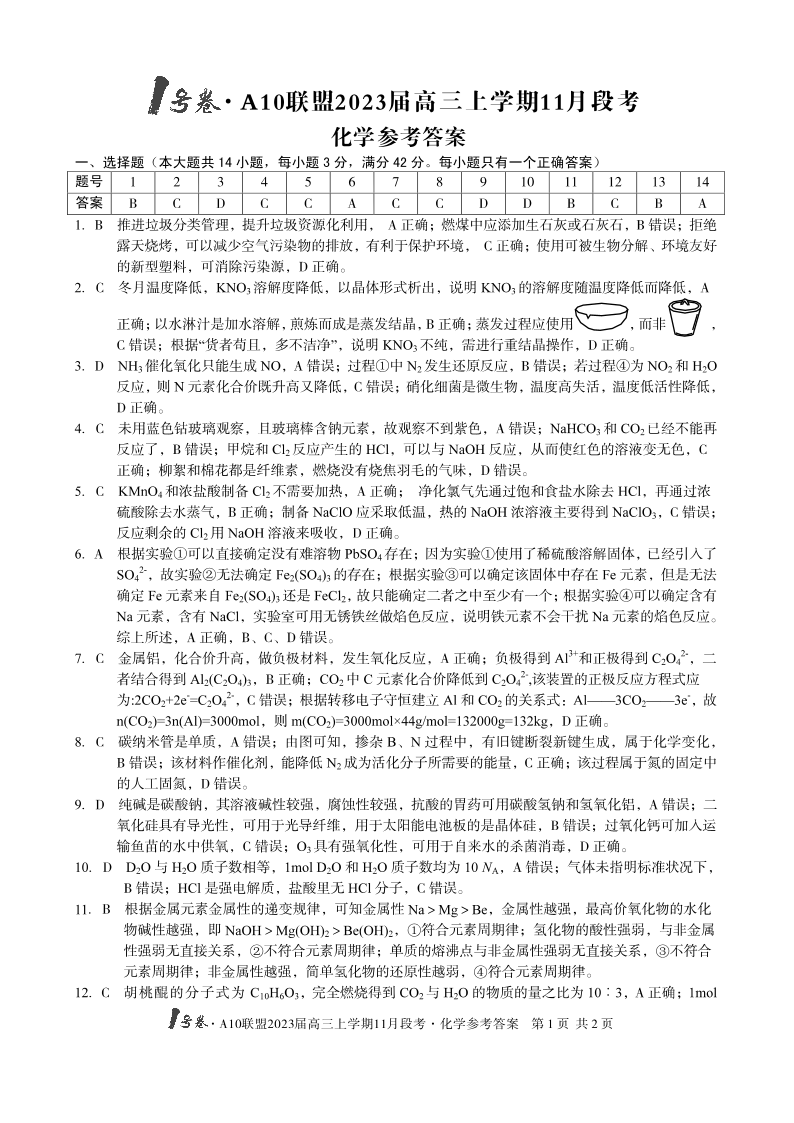 高三化学答案--安徽A10联盟2023届高三上学期11月段考