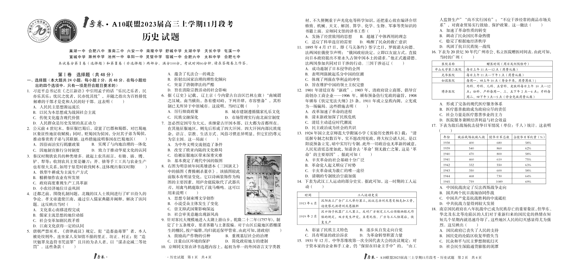 高三历史--安徽A10联盟2023届高三上学期11月段考