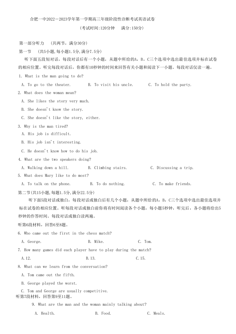 高三英语+答案--安徽省合肥市第一中学高三上学期11月月考