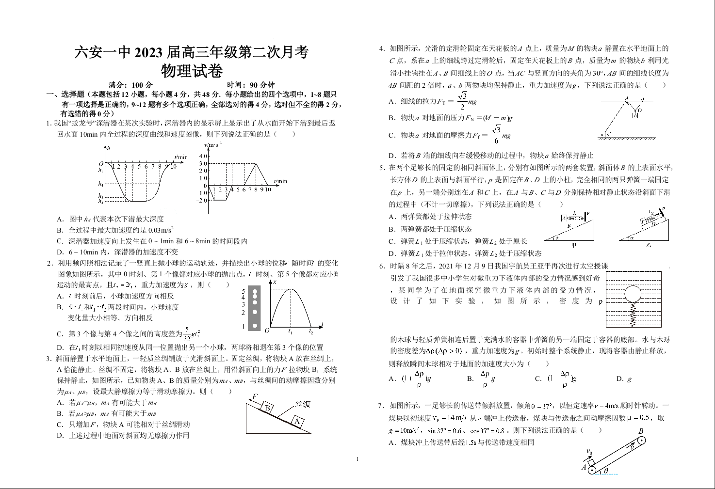 高三物理+答案--安徽省六安第一中学高三上学期第二次月考