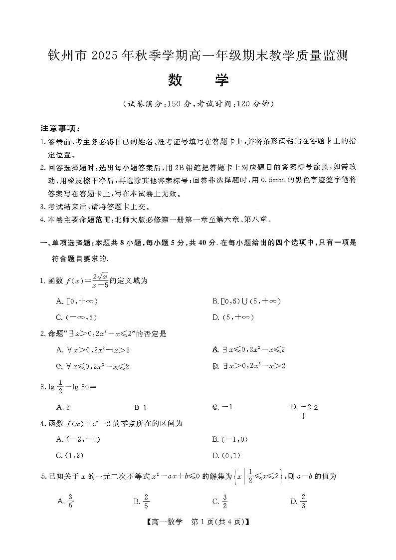高一数学--广西钦州市2025-2026高一上学期期末教学质量检测