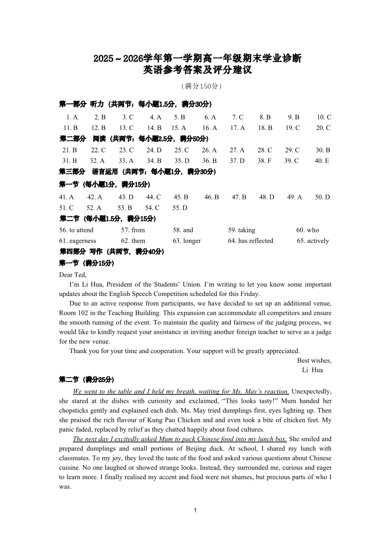 高一英语答案--山西省太原市2025-2026学年高一上学期期末学业诊断