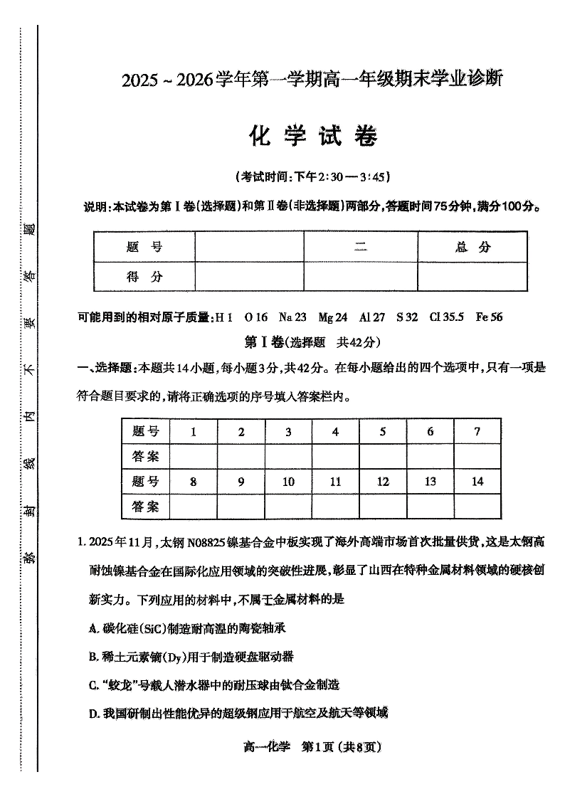 高一化学--山西省太原市2025-2026学年高一上学期期末学业诊断
