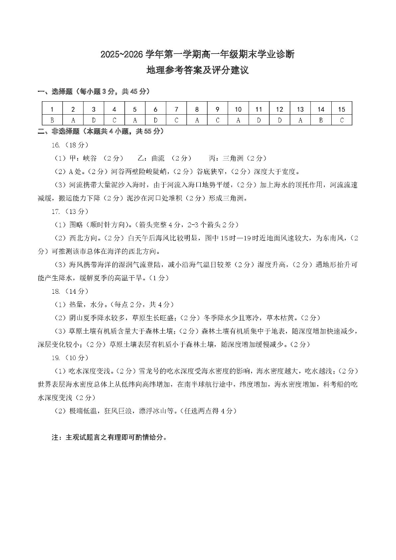 高一地理答案--山西省太原市2025-2026学年高一上学期期末学业诊断