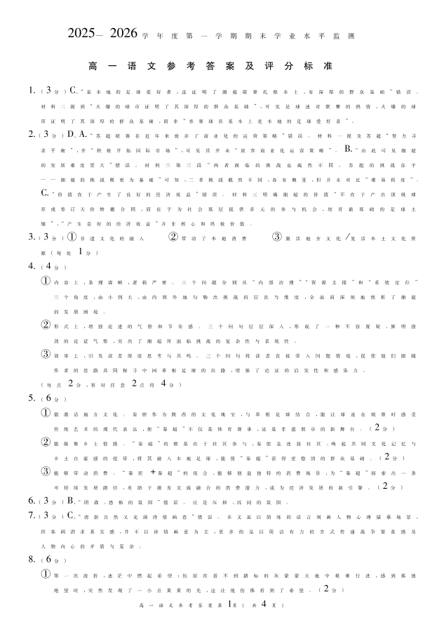 高一语文答案--安徽省蚌埠市2025—2026学年度高一第一学期期末学业水平监测