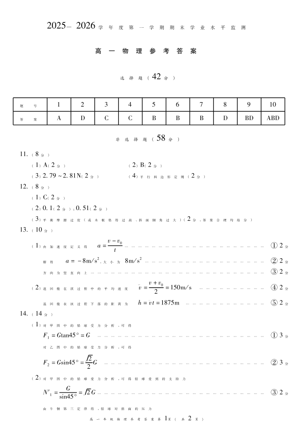 高一物理答案--安徽省蚌埠市2025—2026学年度高一第一学期期末学业水平监测