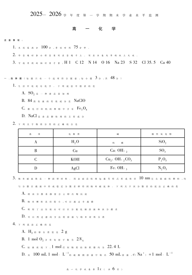 高一化学--安徽省蚌埠市2025—2026学年度高一第一学期期末学业水平监测