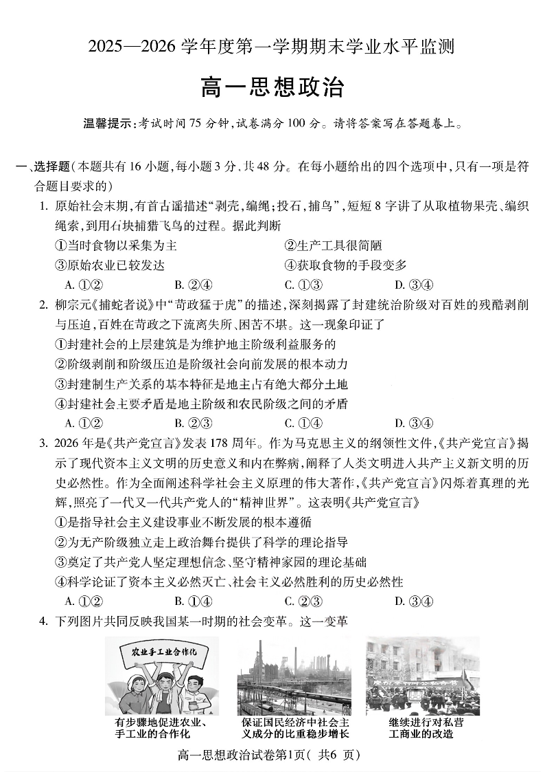 高一政治--安徽省蚌埠市2025—2026学年度高一第一学期期末学业水平监测