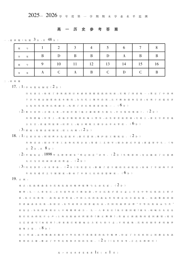 高一历史答案--安徽省蚌埠市2025—2026学年度高一第一学期期末学业水平监测