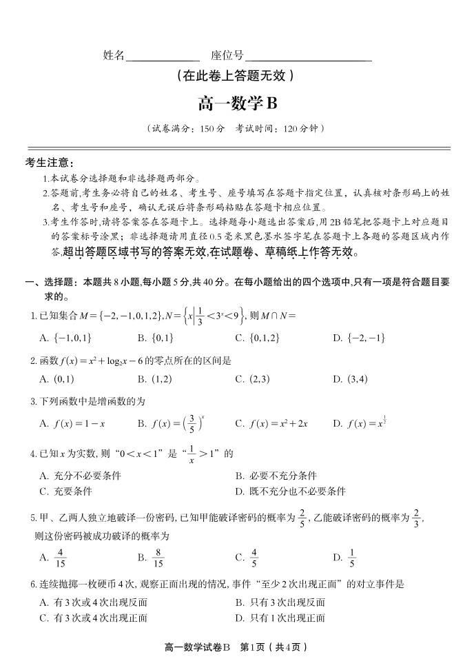 高一数学B--安徽省皖江名校联盟2025-2026学年上学期高一期末考试