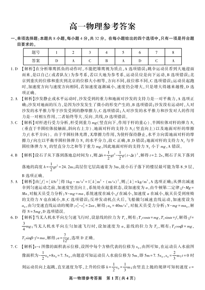 高一物理答案--安徽省皖江名校联盟2025-2026学年上学期高一期末考试