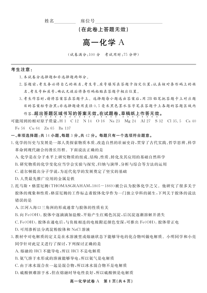 高一化学A--安徽省皖江名校联盟2025-2026学年上学期高一期末考试