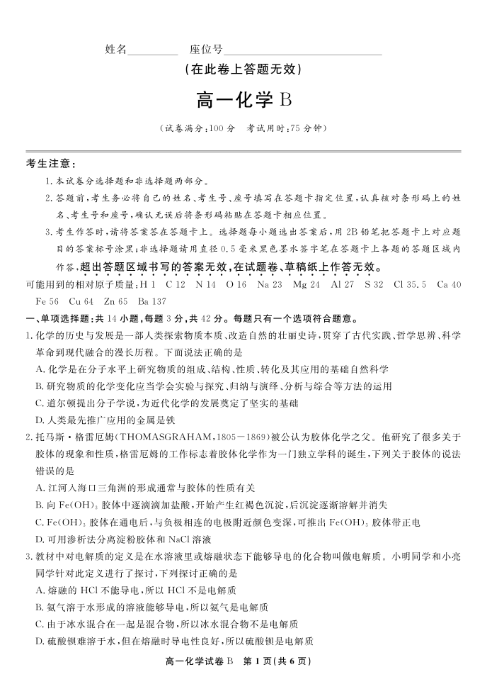 高一化学B--安徽省皖江名校联盟2025-2026学年上学期高一期末考试