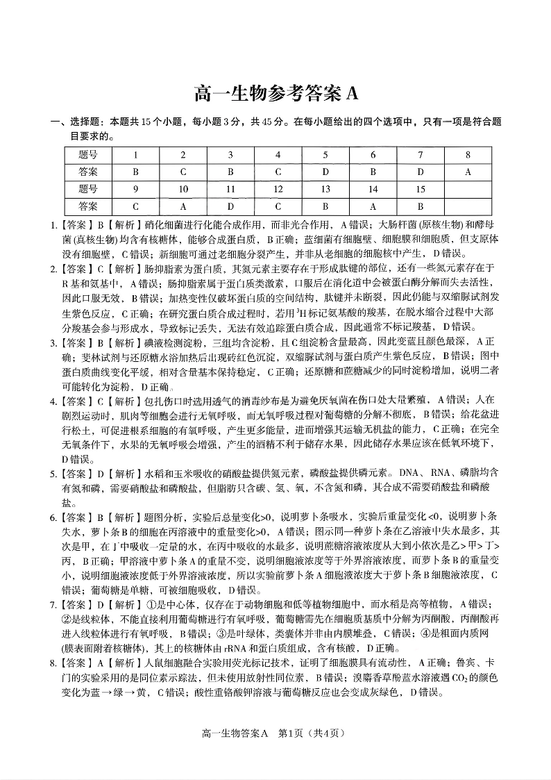 高一生物答案A--安徽省皖江名校联盟2025-2026学年上学期高一期末考试