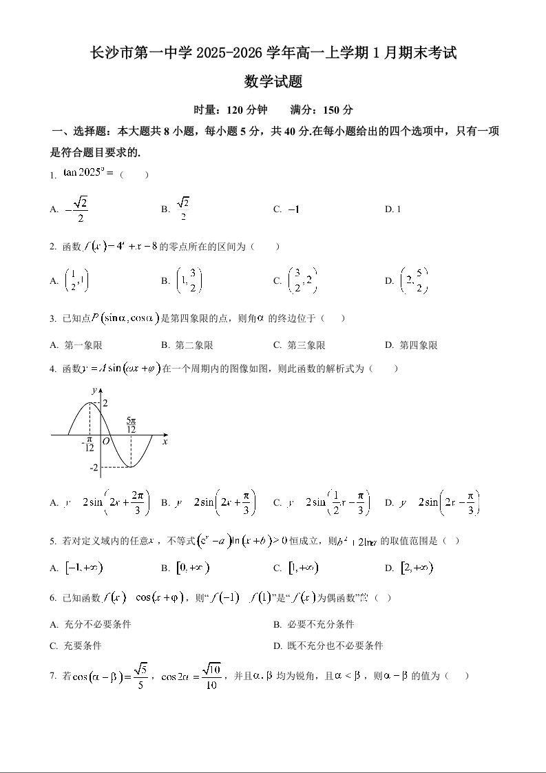 高一数学--湖南省长沙市第一中学2025-2026学年高一上学期1月期末考试