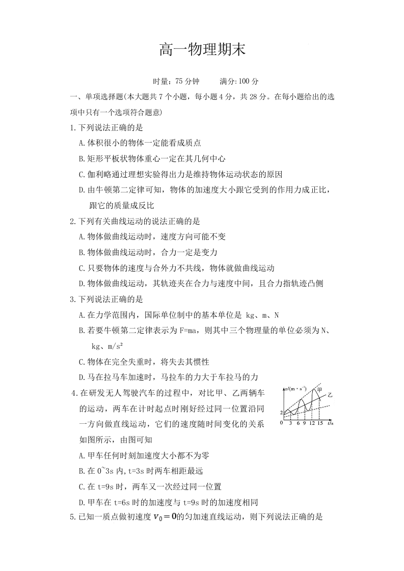 高一物理--湖南省长沙市第一中学2025-2026学年高一上学期1月期末考试