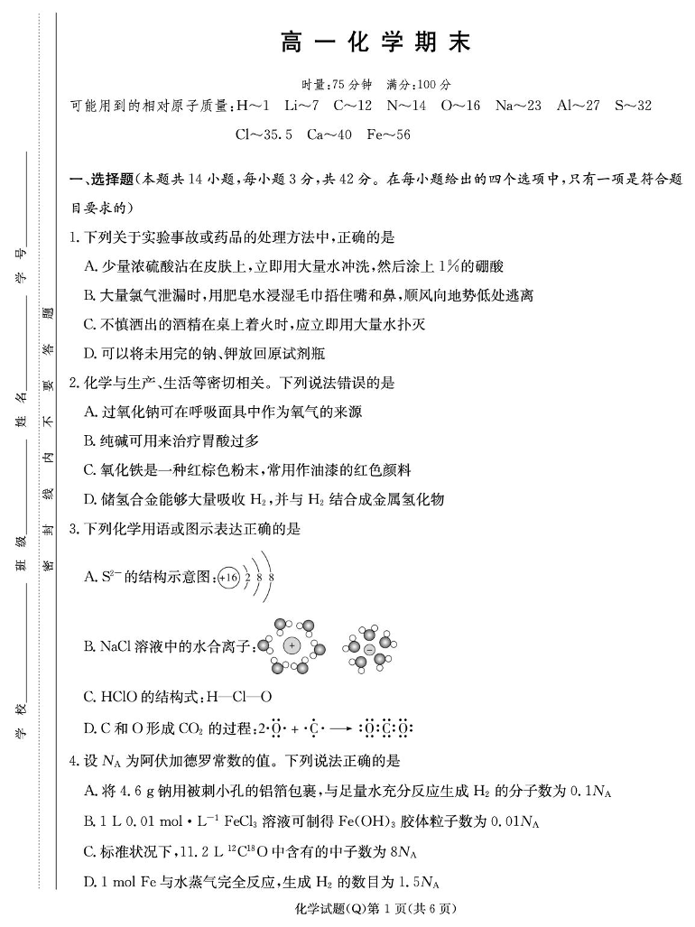 高一化学--湖南省长沙市第一中学2025-2026学年高一上学期1月期末考试