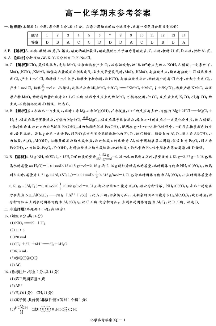 高一化学答案--湖南省长沙市第一中学2025-2026学年高一上学期1月期末考试