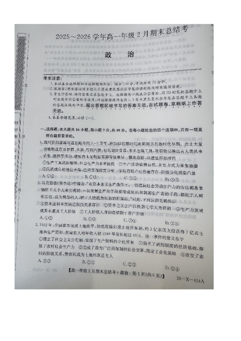 高一政治--山西省三晋卓越联盟2025-2026学年高一年级2月期末总结考