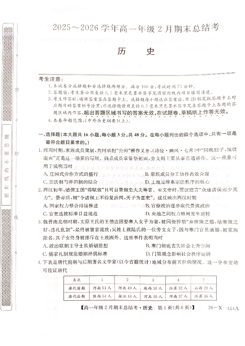 高一历史--山西省三晋卓越联盟2025-2026学年高一年级2月期末总结考