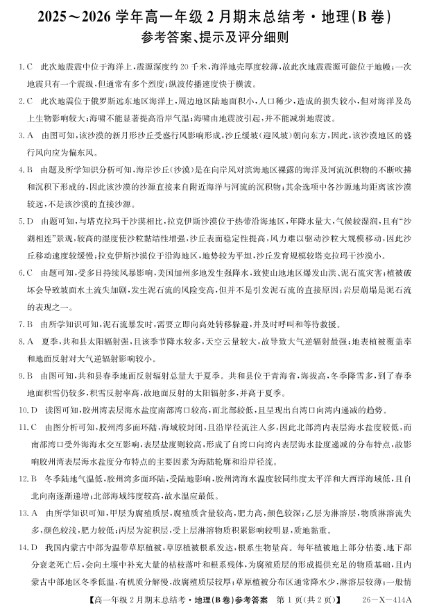 高一地理答案--山西省三晋卓越联盟2025-2026学年高一年级2月期末总结考