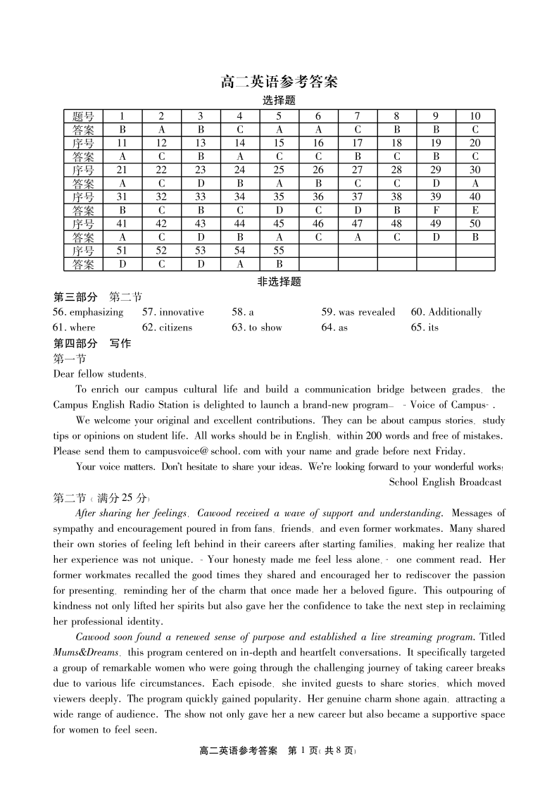 高二英语答案--安徽省鼎尖联考2025-2026学年高二上学期期末过程性学科素质评价