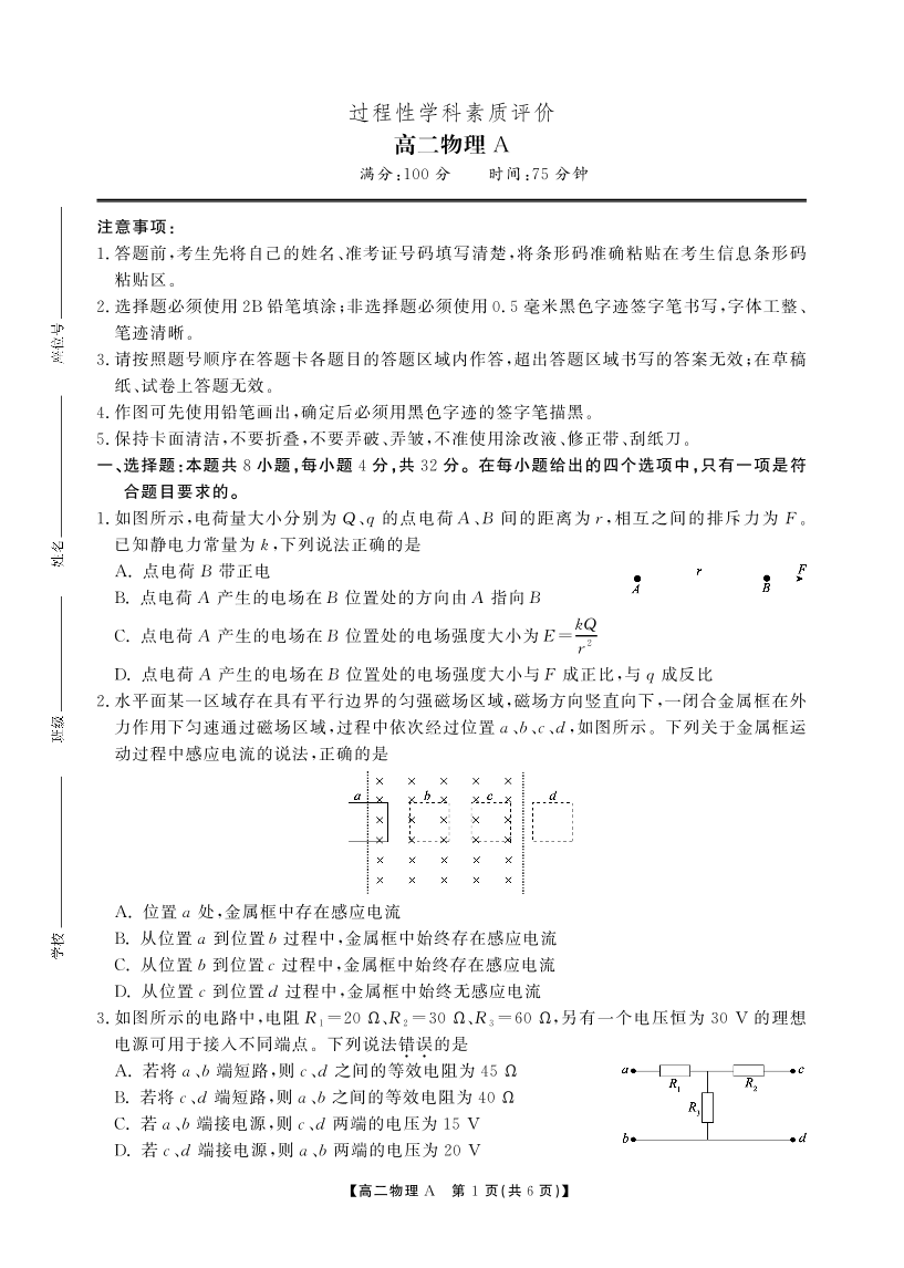 高二物理A卷--安徽省鼎尖联考2025-2026学年高二上学期期末过程性学科素质评价