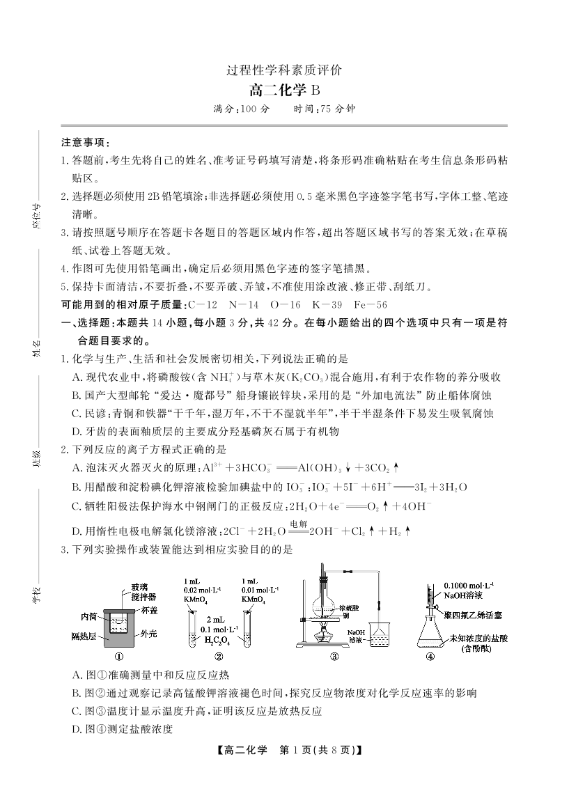 高二化学B--安徽省鼎尖联考2025-2026学年高二上学期期末过程性学科素质评价