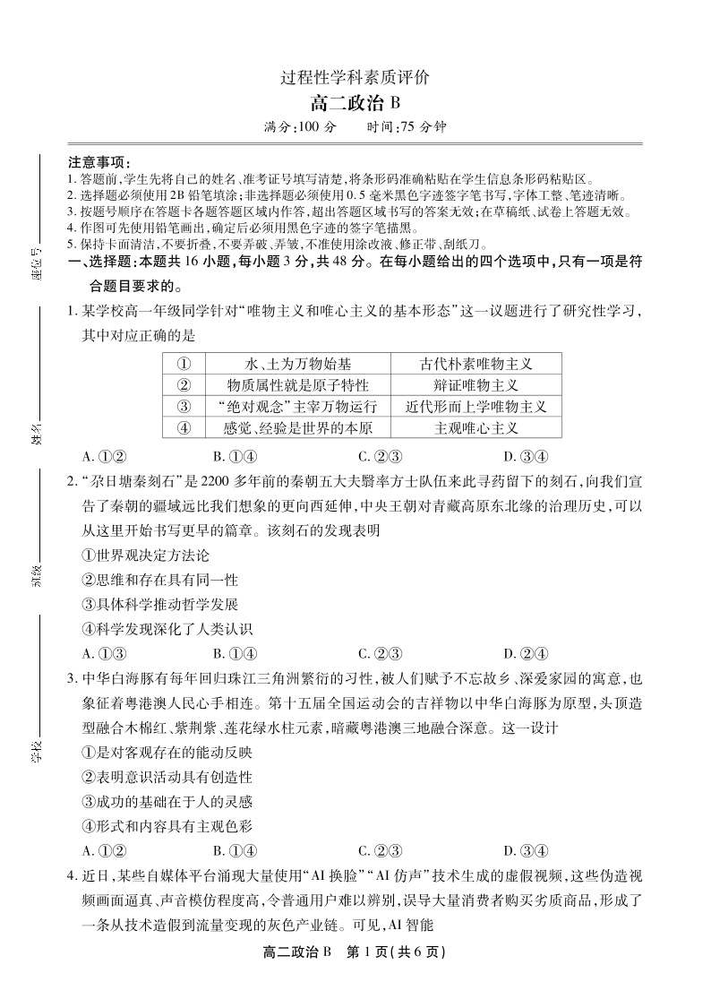高二政治B--安徽省鼎尖联考2025-2026学年高二上学期期末过程性学科素质评价