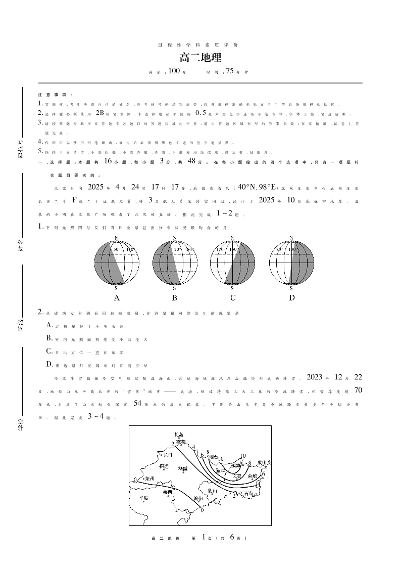 高二地理--安徽省鼎尖联考2025-2026学年高二上学期期末过程性学科素质评价