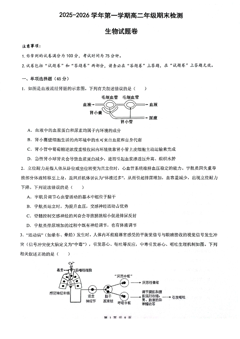 高二生物--安徽省智学大联考·皖中名校联盟2025-2026学年高二上学期期末检测